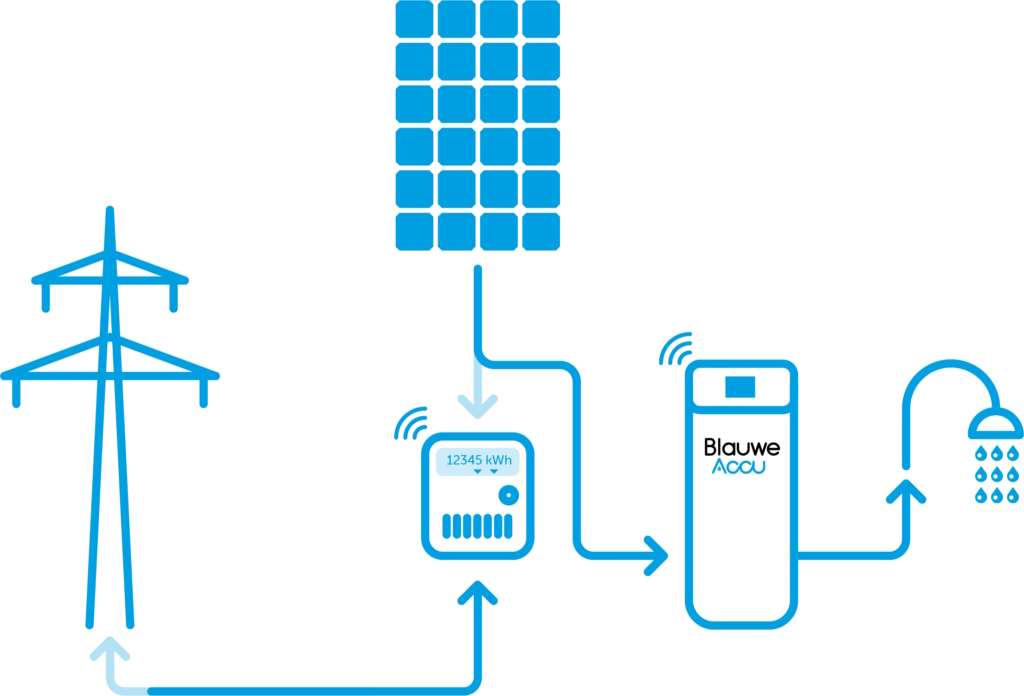 Met een Blauwe Accu slaat u de stroom van uw zonnepanelen op in warm water.