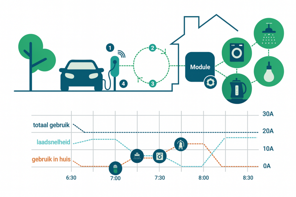 Met load balancing voorkomen we dat de hoofdzekering overbelast raakt en blijft uw installatie veilig, ook bij gelijktijdig gebruik van andere apparaten. Staat bijvoorbeeld de wasmachine aan? Dan laadt de auto minder snel op. Alle elektrische apparaten in uw woning hebben voorrang op het laadstation. De overige capaciteit is beschikbaar voor het opladen van de auto.