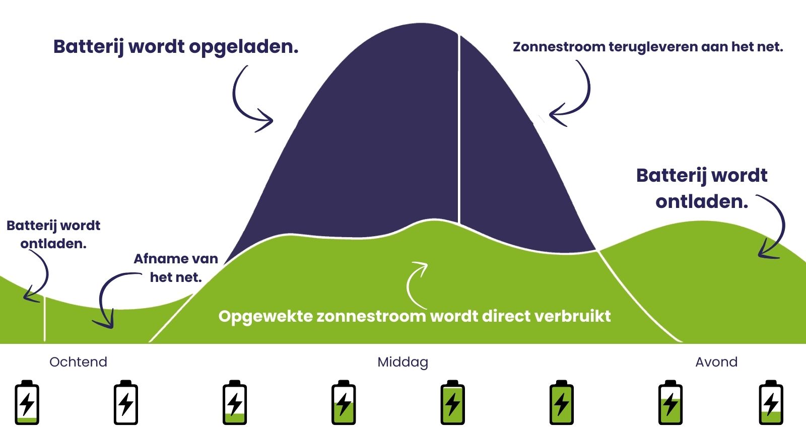 Bij zonnig weer slaat de batterij automatisch de overtollige zonne-energie op. Die energie gebruikt u later op de dag, waardoor u minder hoeft terug te leveren en uw zelfverbruik tot wel 70% stijgt.