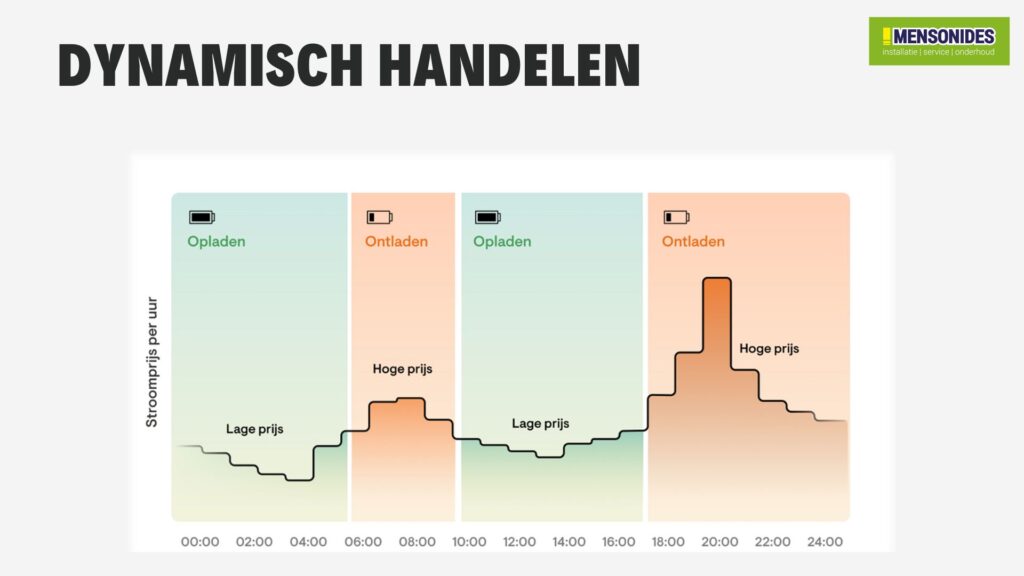 Heeft u een dynamisch energiecontract? Dan speelt de batterij automatisch in op de wisselende uurprijzen: laden tijdens goedkope uren en ontladen wanneer de prijs het hoogst is.