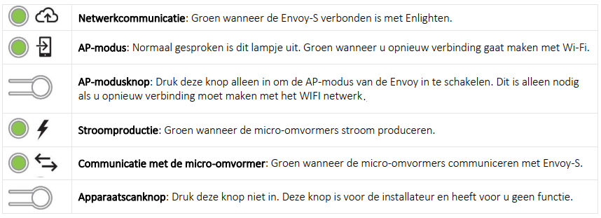Hieronder staat de betekenis van de lampjes op de Envoy.