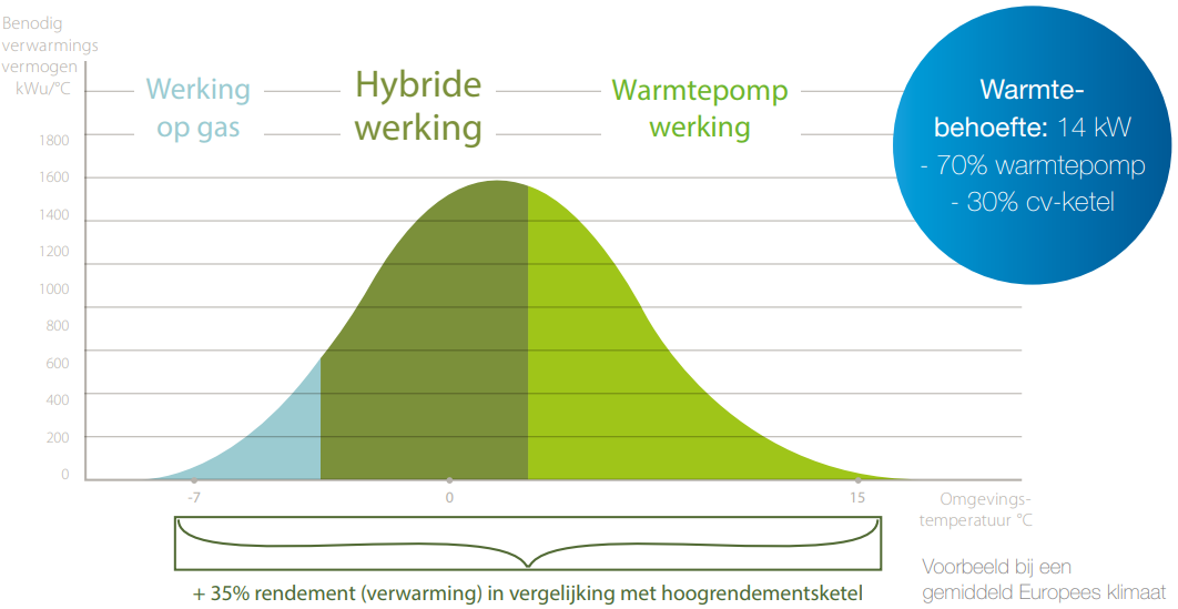 Daalt de buitentemperatuur drastisch, dan is gebruik van de warmtepomp in hybridemodus niet efficiënt meer. Op dat moment zal het systeem automatisch overschakelen naar een werking op uitsluitend gas.