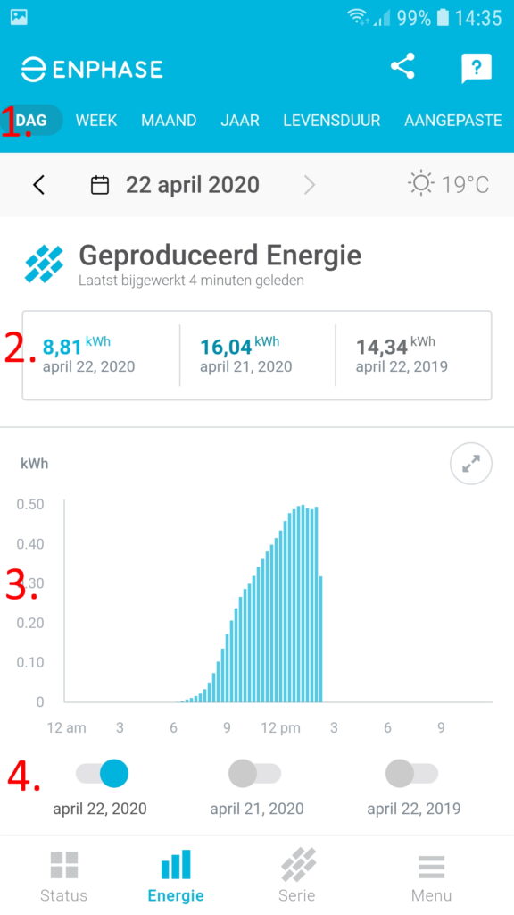 Op dit tabblad krijgt u nog meer informatie over de opgewekte energie. U kunt hier bijvoorbeeld zien hoeveel de zonnepanelen over de hele dag hebben gepresteerd.