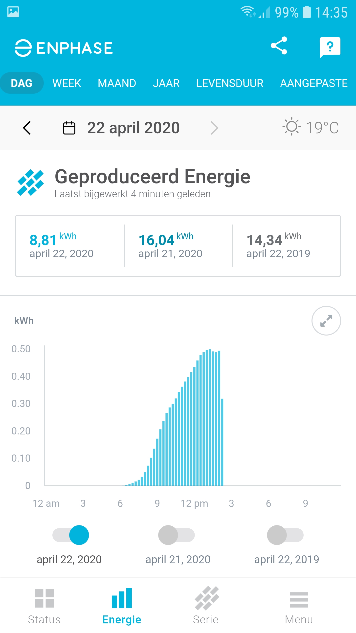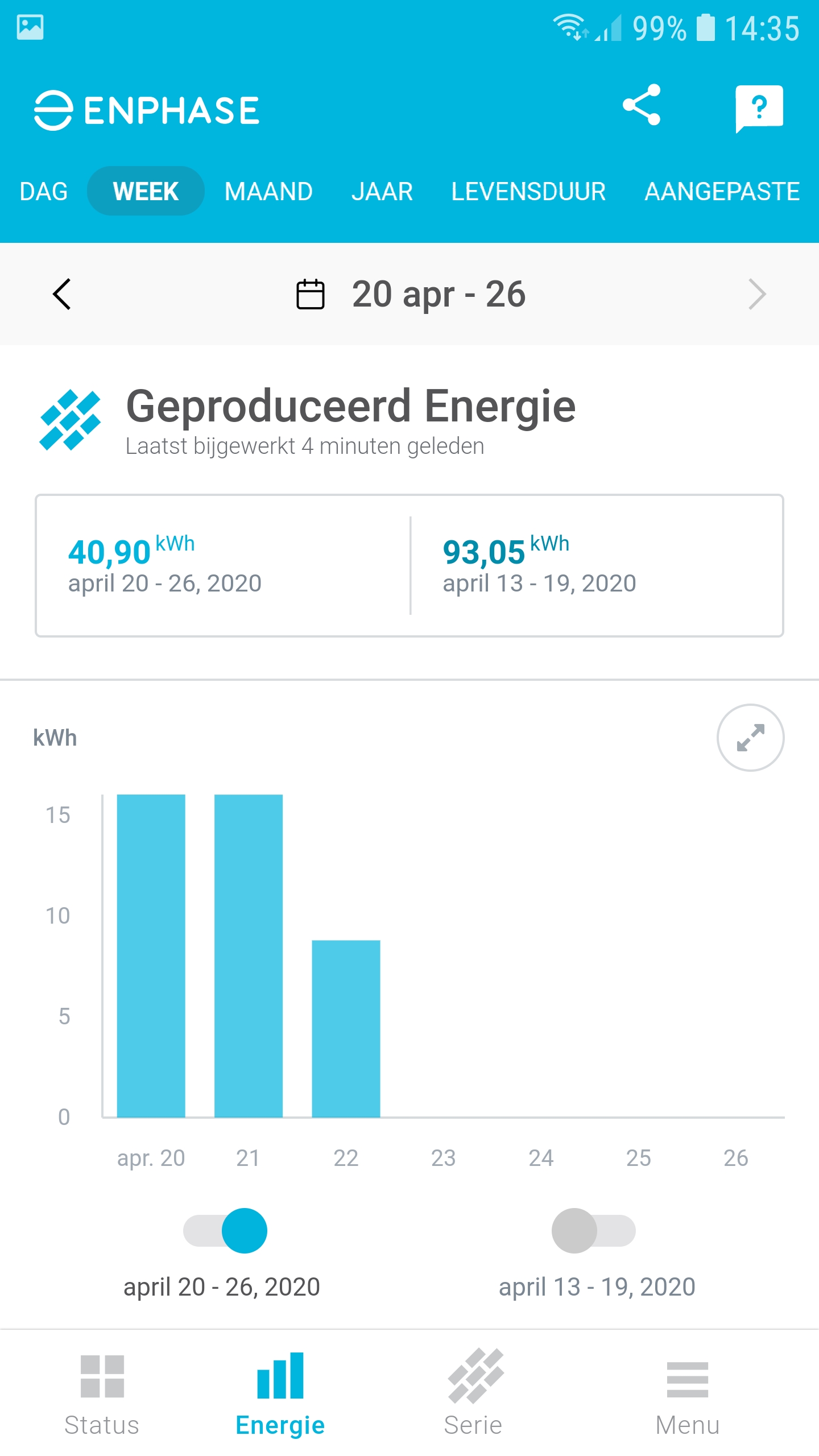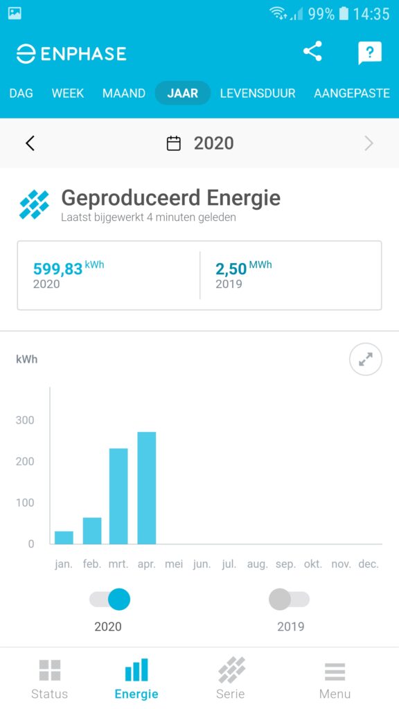 Ook vindt u hier de historische opgewekte zonne-energie terug. U kunt eenvoudig zien hoeveel de zonnepanelen per jaar, maand, week, dag of zelfs per uur hebben opgewekt.