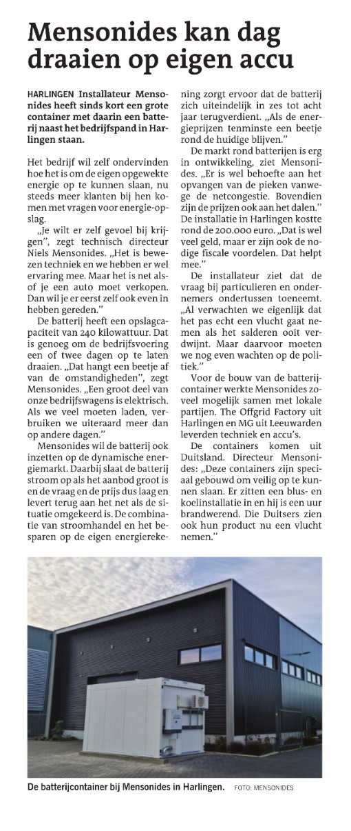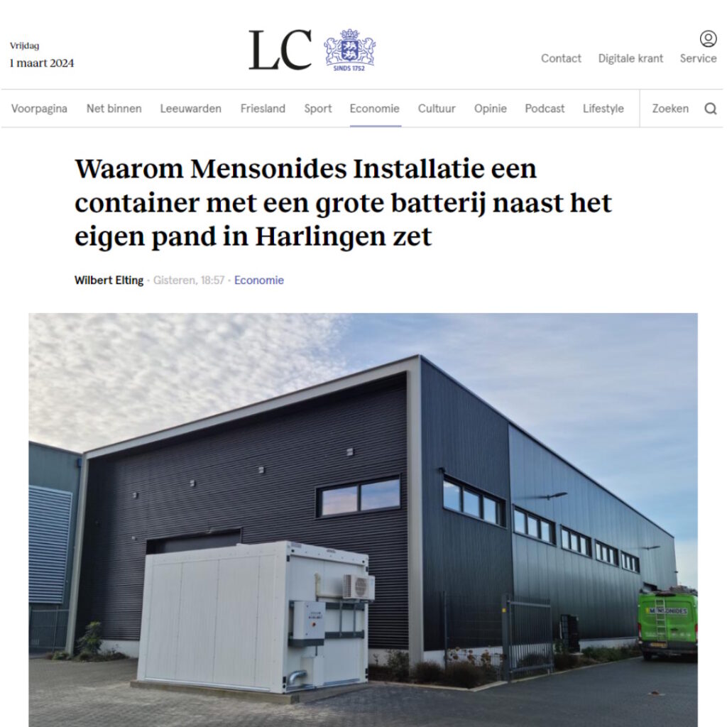 In de Leeuwarder Courant van vrijdag 1 maart 2024 staat, in de economie bijlage, een mooi artikel over de batterijcontainer die recent bij ons pand is geplaatst. Ook is het artikel op de website van de LC geplaatst.