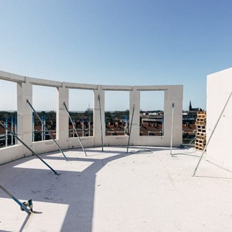 Op 13 april 2021 is begonnen met het plaatsen van de kalkzandsteenwanden op de vijfde verdieping van het appartementen complex Oosterhof in Harlingen.