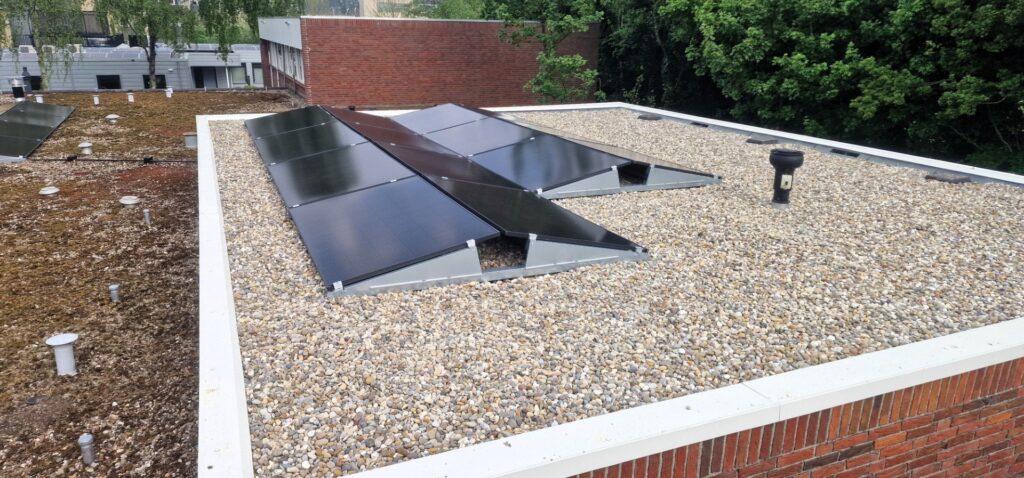 De 54 zonnepanelen zijn geplaatst op verschillende dakvlakken met een oost-westoriëntatie.