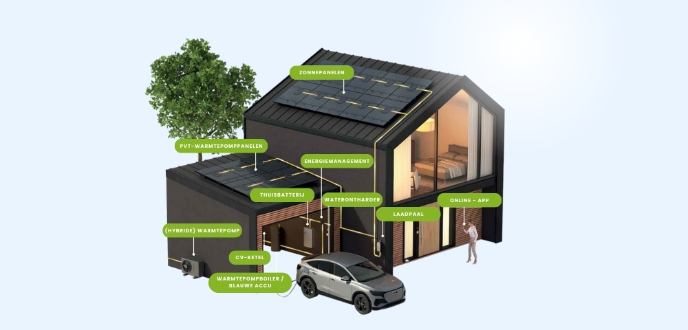 Het Energiemanagement Systeem brengt in de toekomst de zonne-energie, batterijen, laadpalen, (hybride) warmtepompen, warmtepompboilers enz. samen in één compleet pakket.