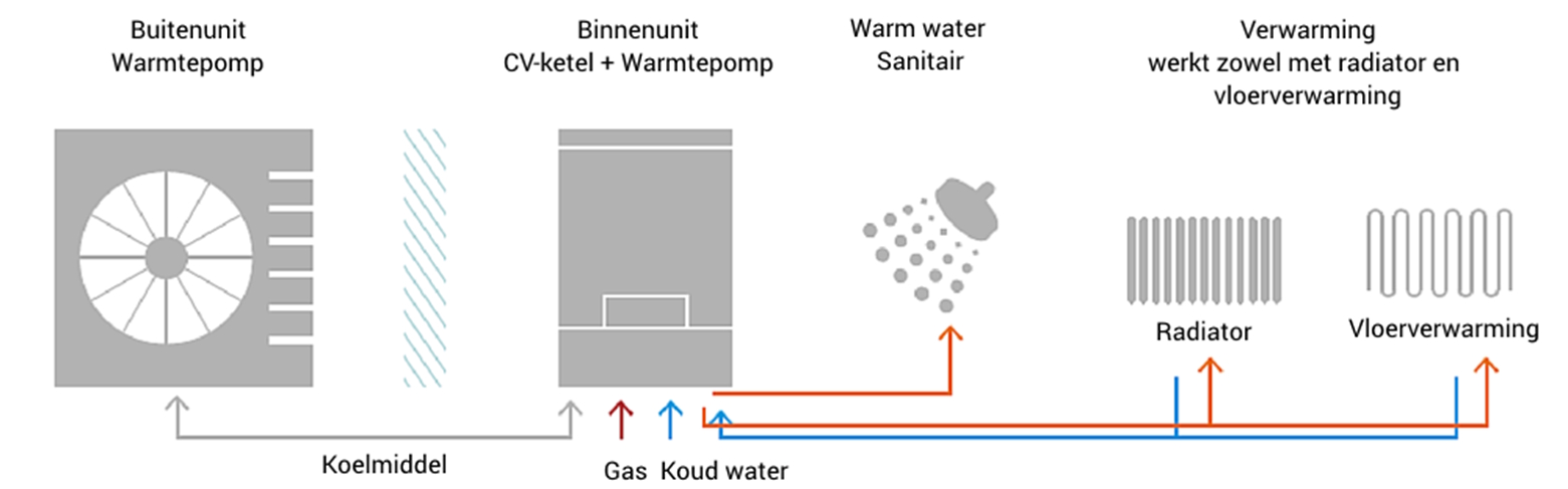 Een Hybride Warmtepomp werkt samen met een CV-ketel. En is een goede tussenstap voor gasloos wonen. Met een Hybride Warmtepomp verbruikt u nog wel gas, maar wel een stuk minder.