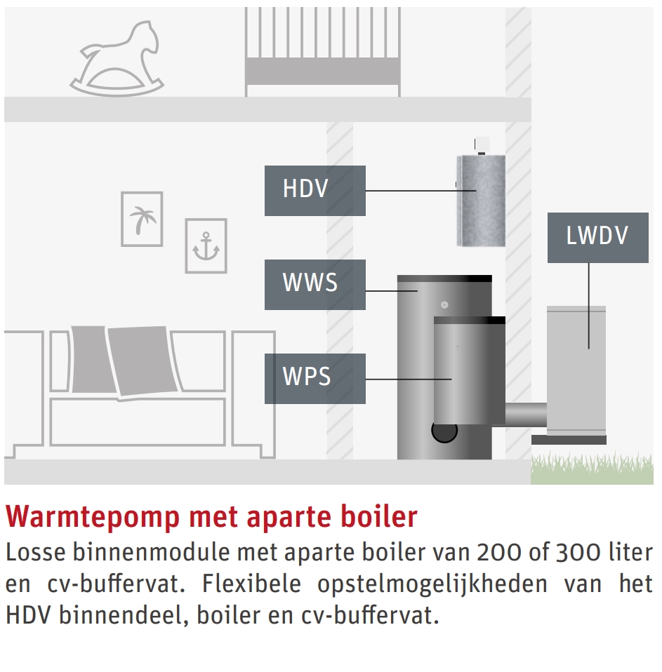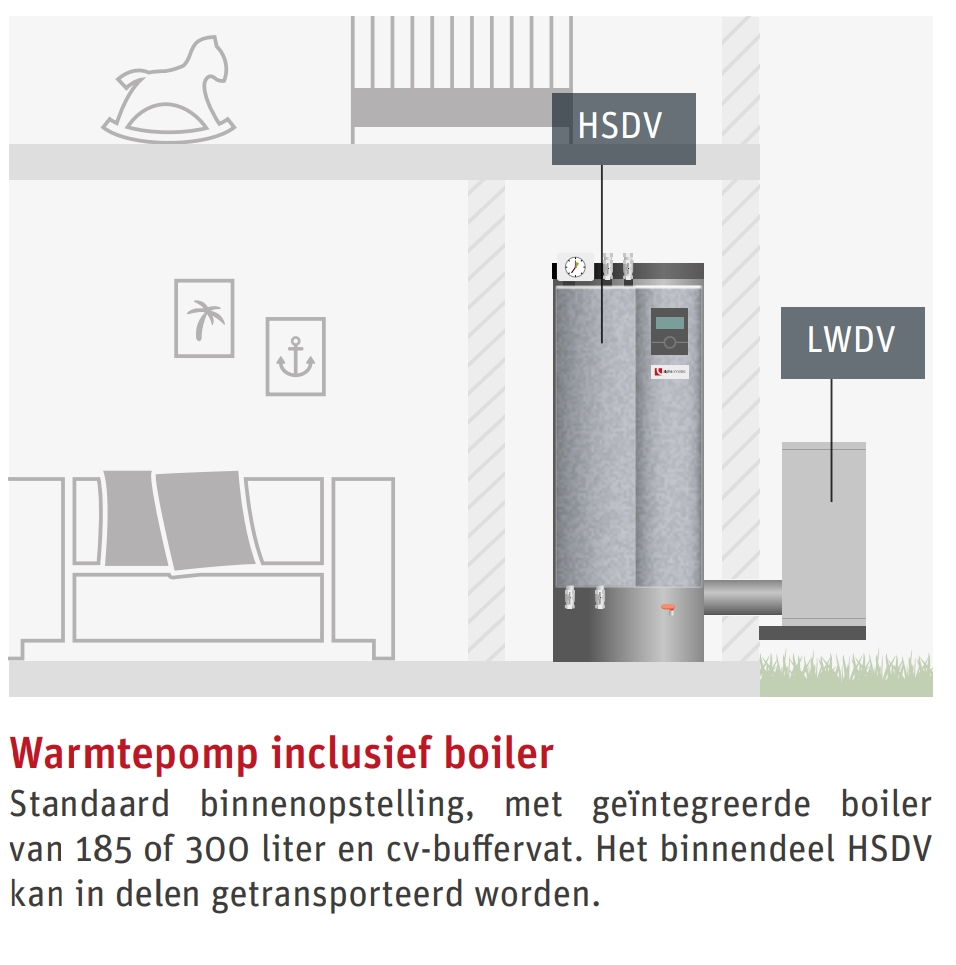 Bij het HSDV binnendeel zijn alle componenten geïntegreerd (zoals de regeling, waterpomp, boiler en CV-buffervat). Het HSDV binnendeel is leverbaar met een boiler van 185 liter of 300 liter.